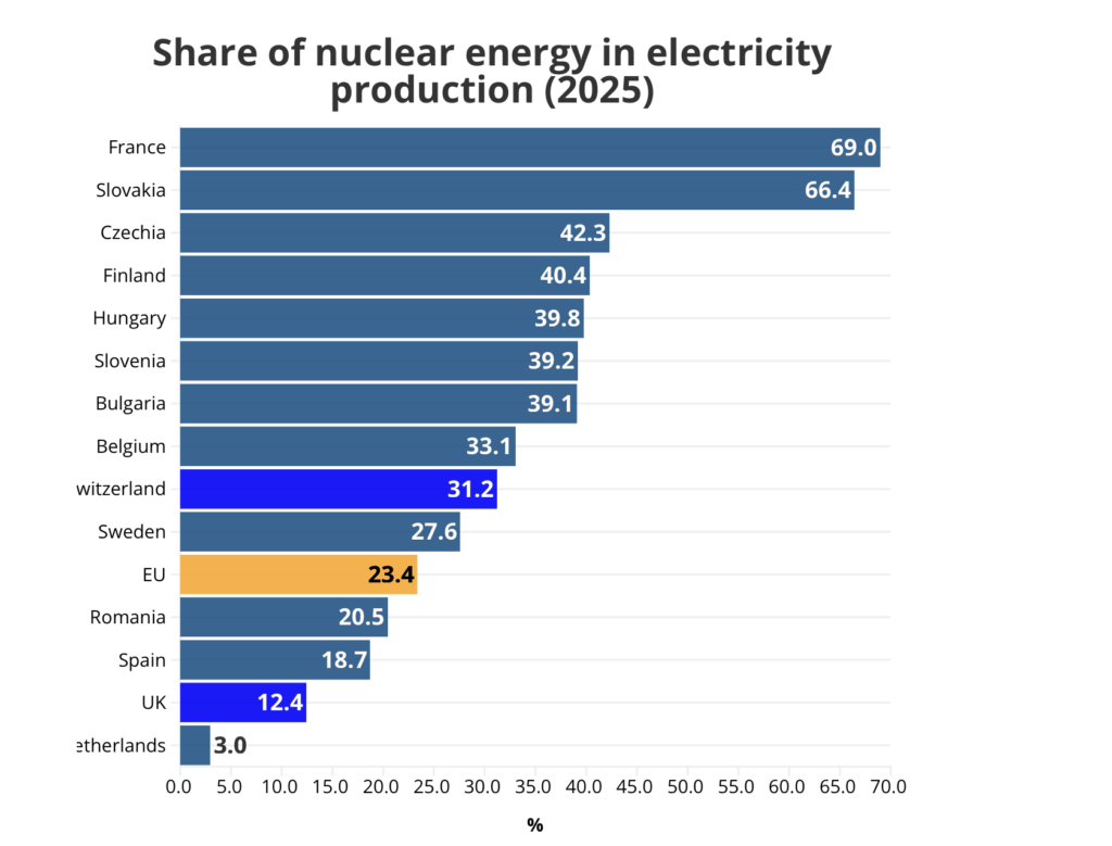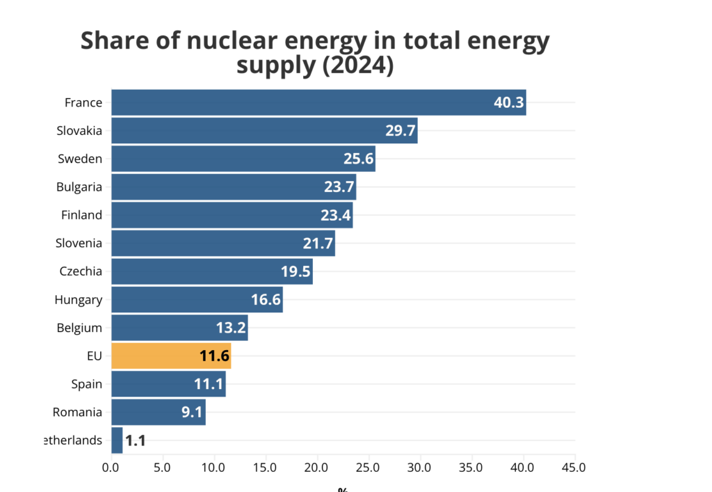 Pesha e energjisë bërthamore ndryshon ndjeshëm nga një vend në tjetrin. Franca mbetet vendi me varësinë më të lartë, ku kjo formë energjie përbën mbi 40% të miksit energjetik dhe rreth 69% të prodhimit të energjisë elektrike. Pas saj renditen Sllovakia, Suedia dhe Bullgaria me nivele mbi 20%.