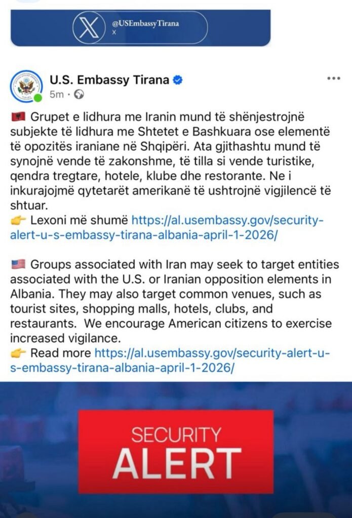 Ambasada e Shteteve të Bashkuara në Tiranë ka lëshuar një njoftim sigurie, duke paralajmëruar për një rrezik të mundshëm nga grupe të lidhura me Iranin në Shqipëri.