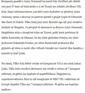 Përveç kësaj, zonja Sula është denoncuar publikisht nga opozita si e lidhur me bandat e Elbasanit. Sipas Sali Berishës pas Yllka Sulas qëndron Arjan Ormenaj, një biznesmen i cili dyshohet se ka pastruar paratë për llogari të klanit Copja në Elbasan.