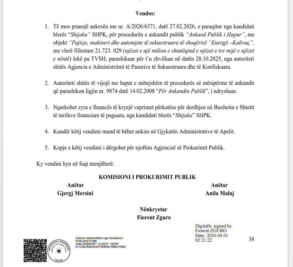 Por në vendimin përfundimtar, KPP i rrëzoi të gjitha pretendimet e kompanisë, duke vendosur: “Të mos pranojë ankesën… të paraqitur nga kandidati blerës ‘Shijaku’ SHPK”.