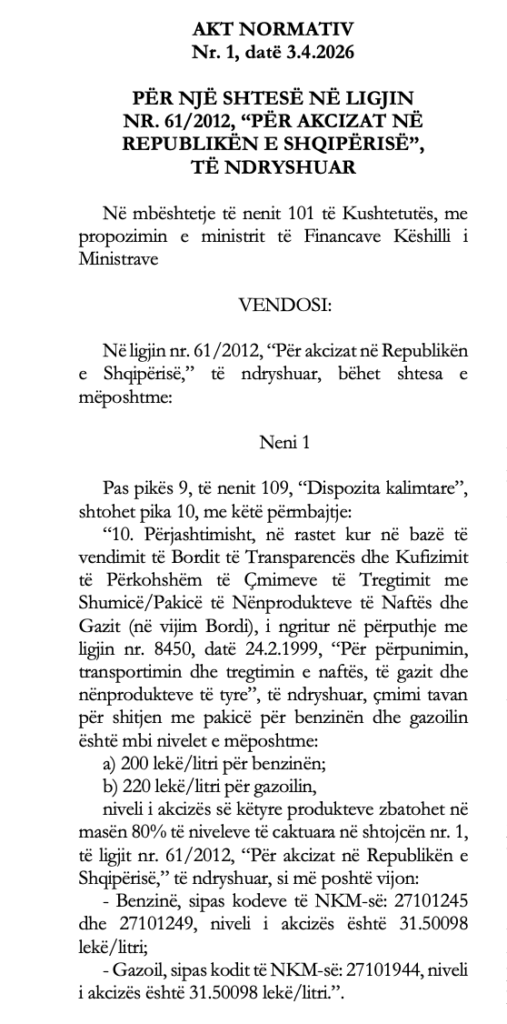 Qeveria ka miratuar një akt normativ që parashikon uljen e akcizës për karburantet, por kjo masë nuk është automatike dhe hyn në fuqi vetëm në kushte të caktuara.