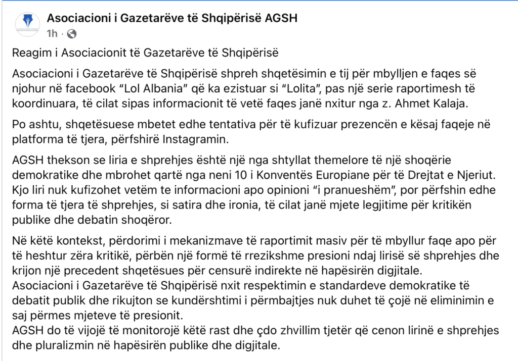 Ndërkohë, Asociacioni i Gazetarëve të Shqipërisë ka reaguar duke shprehur shqetësim për mbylljen e faqes dhe përpjekjet për të kufizuar praninë e saj në platforma të tjera.