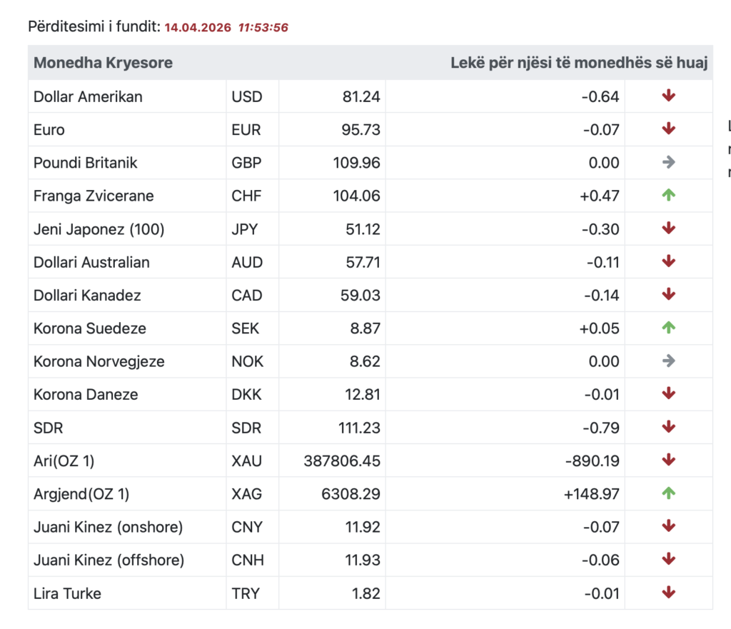 Sipas të dhënave të publikuara nga Banka e Shqipërisë, më 14 prill 2026, dollari amerikan ka zbritur në 81.24 lekë, duke humbur 0.64 lekë vetëm në një ditë. Edhe euro ka shënuar rënie, duke u këmbyer me 95.73 lekë, me një ulje prej 0.07 lekësh.