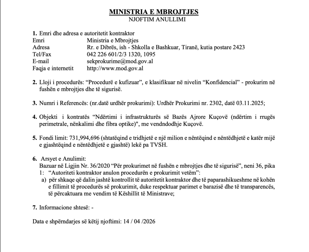 Ministria e Mbrojtjes ka publikuar më 14 prill 2026 njoftimin për anulimin e një procedure të kufizuar prokurimi, të klasifikuar në nivelin “konfidencial”, në fushën e mbrojtjes dhe sigurisë.
