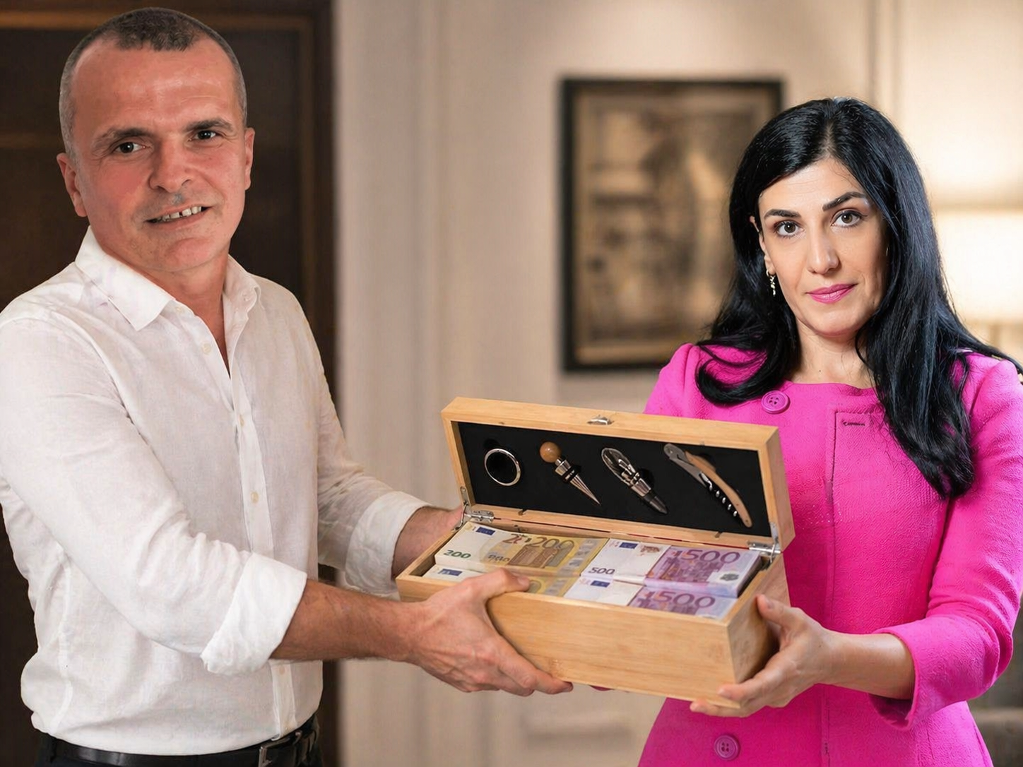 Në qendër të kësaj skeme dalin emrat e Ergys Agasit dhe Ermal Beqirit, të cilët sipas materialeve hetimore, përdornin një metodë të pazakontë për dorëzimin e parave: kuti shishesh vere të mbushura me kartmonedha euro në prerje 100, 200 dhe 500.