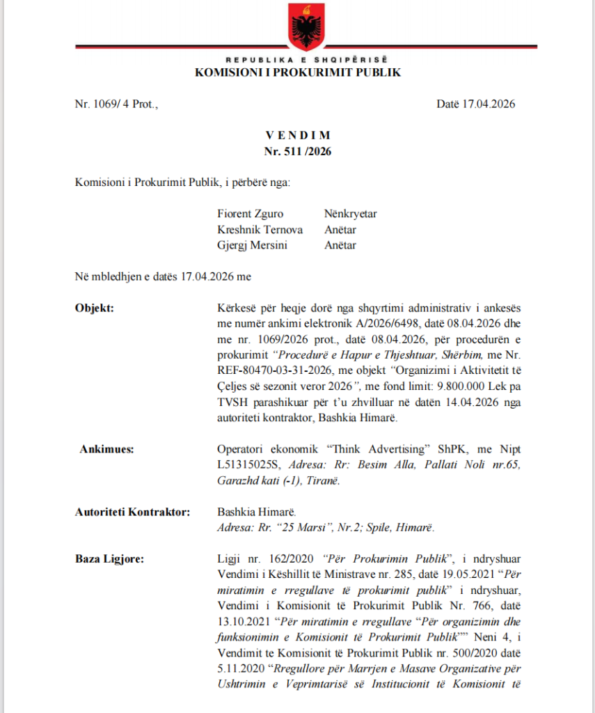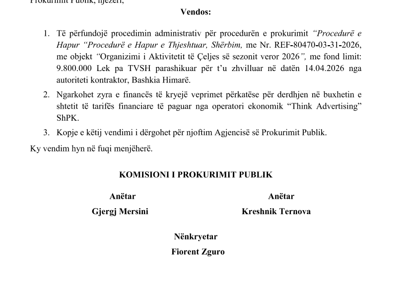 Në qendër të vëmendjes ka qenë edhe tenderi me fond 9 800 000 lekë (pa TVSH) për “Organizim i aktivitetit të çeljes së sezonit veror”, i cili është shoqëruar me ankesa në Komisionin e Prokurimit Publik, duke nxjerrë në pah problematika dhe mungesë transparence mbi mënyrën se si përdoren fondet publike si edhe dyshime për paracaktim të fituesit përmes kritereve teknike.