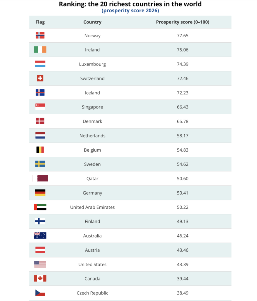 Në krye të renditjes për vitin 2026 qëndron Norvegjia, e cila vlerësohet jo vetëm për të ardhurat e larta, por edhe për mënyrën se si këto të ardhura përkthehen në jetën e përditshme të qytetarëve. Sipas raportit, pasuria nuk matet më vetëm me prodhimin, por me ndikimin konkret që ka tek qytetari i zakonshëm.