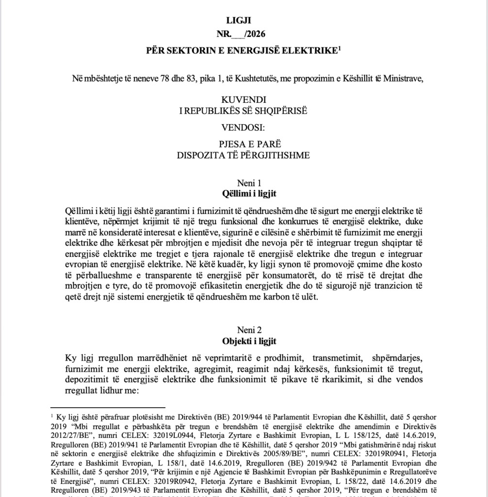 Projektligji shënon një hap drejt transformimit të sektorit energjetik në Shqipëri, duke e zhvendosur atë nga një model i centralizuar në një treg më të hapur, ku energjia nuk trajtohet më vetëm si shërbim publik, por edhe si një produkt ekonomik që mund të prodhohet, të shpërndahet dhe të shitet nga më shumë aktorë. /skyweb.al