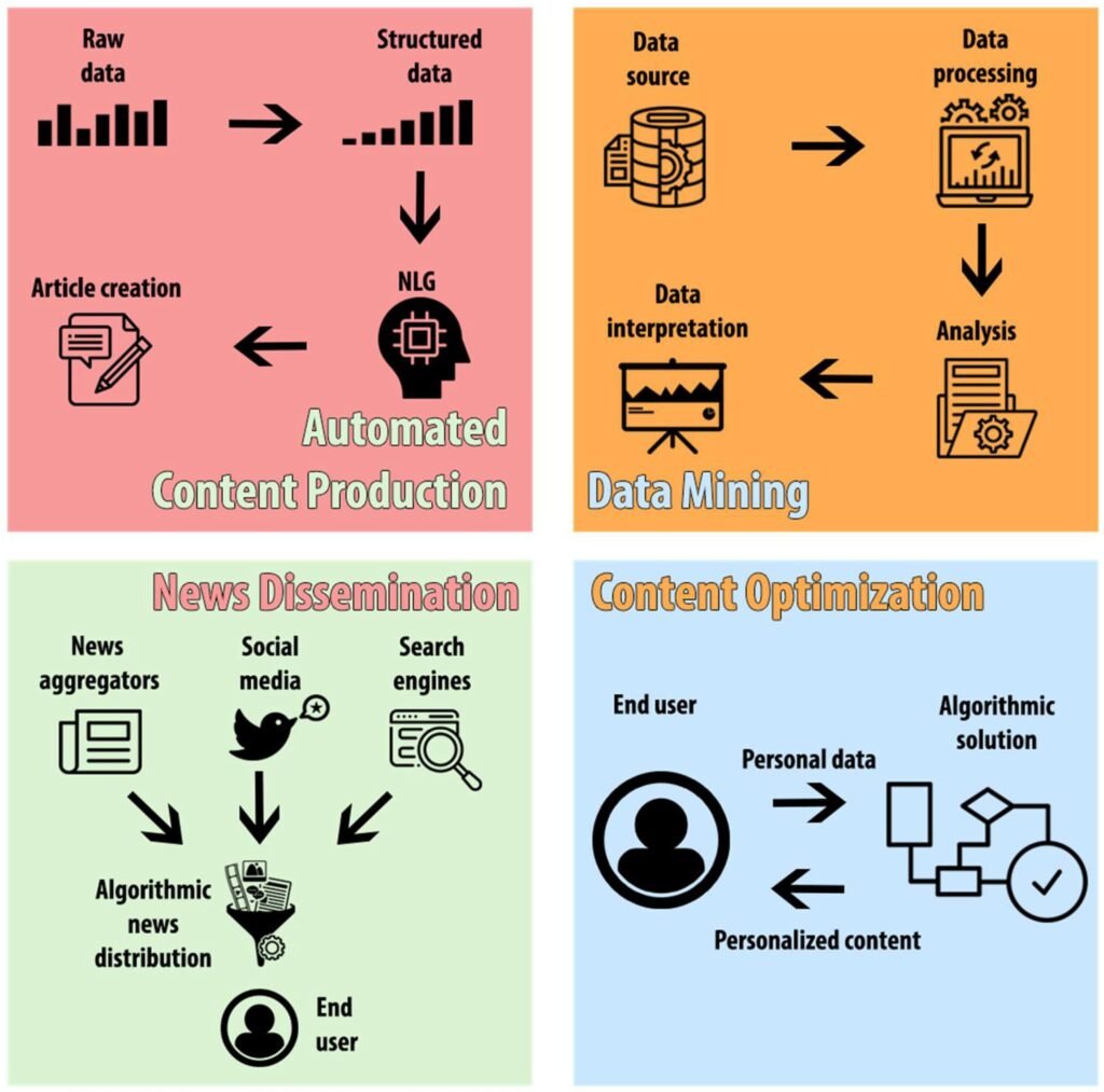 Sistemet e AI përmbledhin lajmet, i riformulojnë ato dhe i personalizojnë sipas profilit të përdoruesit, duke krijuar versione të reja të informacionit. Siç argumenton Nicholas Diakopoulos, automatizimi i gazetarisë po e shndërron algoritmin në një aktor editorial që ndikon drejtpërdrejt në formën e lajmit.