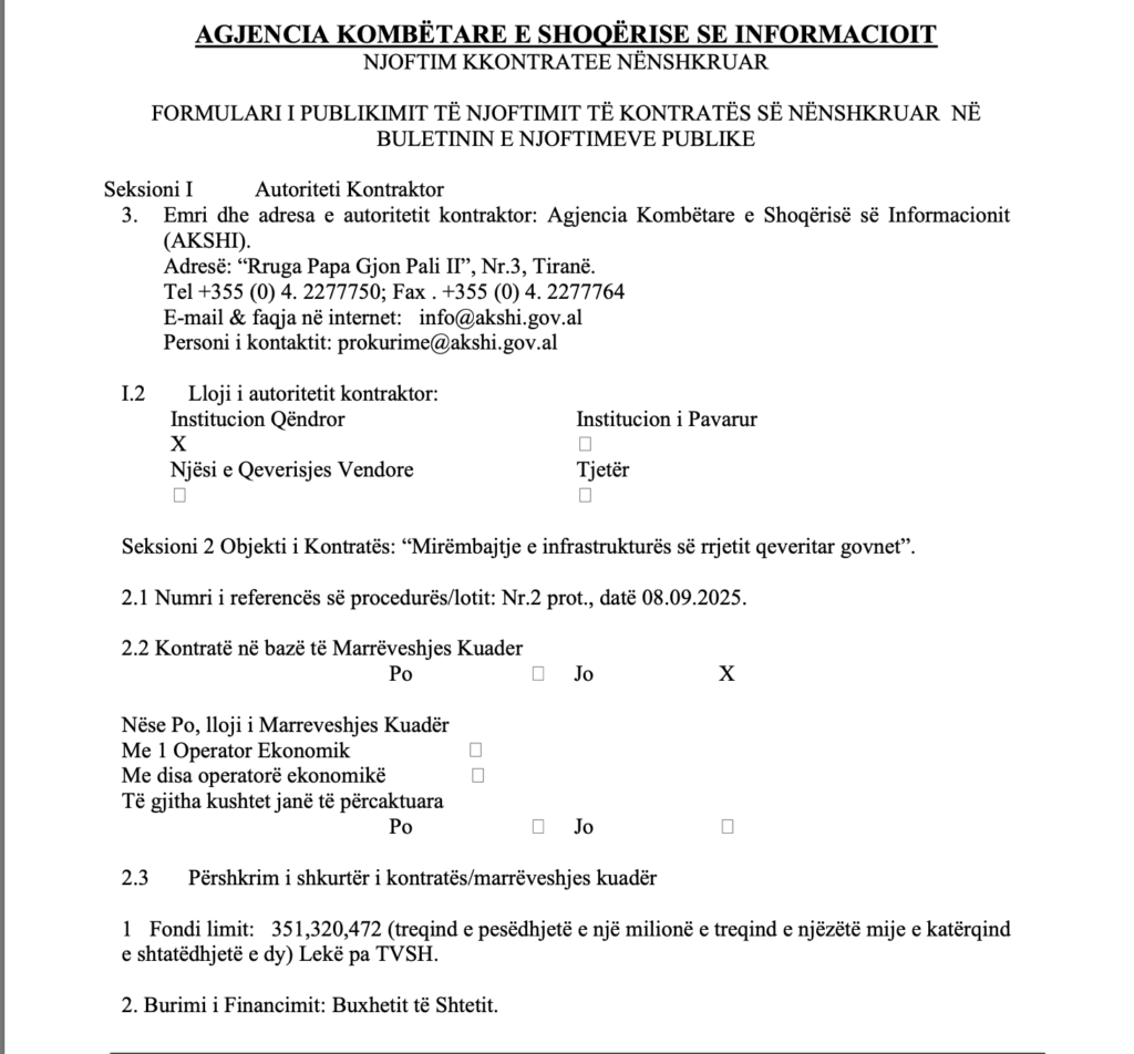 Sipas dokumenteve të konsultuara nga Skyweb.al, kontratat janë firmosur tashmë dhe AKSHI ka bërë njoftimin publik për nënshkrimin e tyre, duke finalizuar një procedurë që ishte raportuar më herët nga skyweb.al që në janar 2026.
