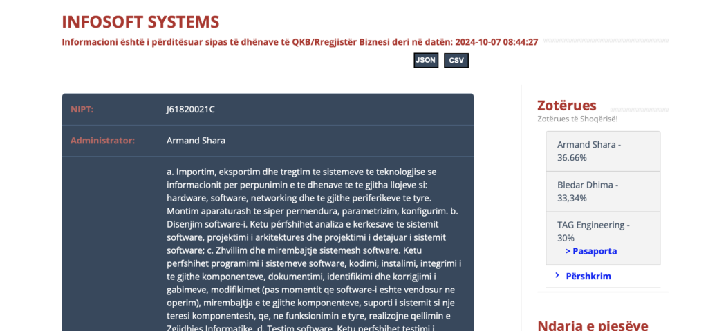 Nga të dhënat zyrtare të Qendrës Kombëtare të Biznesit rezulton se kompania Infosoft Systems shpk ka qenë historikisht në pronësi të Grigor Jotit, por gjatë vitit 2025 struktura e aksioneve ka ndryshuar përmes disa operacioneve, duke kaluar në kontrollin e Armand Sharës dhe Bledar Dhimës, të njohur ndryshe edhe si “çunat” e Jotit.