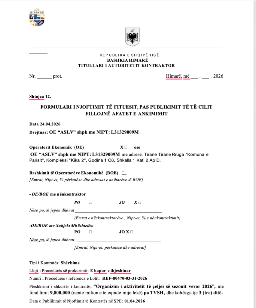 Ndërkohë, sipas dokumenteve që ka konsultuar skyweb.al, këtë vit të dyja procedurat janë fituar nga kompania “ASLV” shpk, e cila rezulton të ketë qenë ofertuesja e vetme në të dy tenderët, duke ngritur një tjetër “flamur të kuq” për mënyrën se si po zhvillohen procedurat nga Bashkia Himarë.