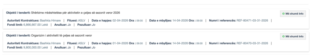 Tenderi i parë ka si objekt “Organizim i aktivitetit të çeljes së sezonit veror 2026” me fond limit 9,800,000 lekë, ndërsa i dyti “Shërbime mbështetëse për aktivitetin e çeljes së sezonit veror 2026” me fond limit 6,866,667 lekë.